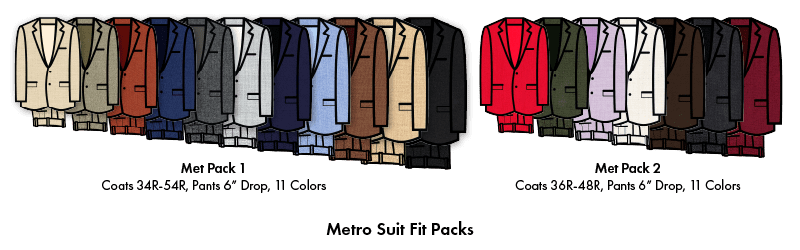 Our Metro Suit Packs are designed as a tool to help you fit almost any suit customer you may have. With 18 colors, and 11 color-matching tie patterns to choose from, the options are limitless!